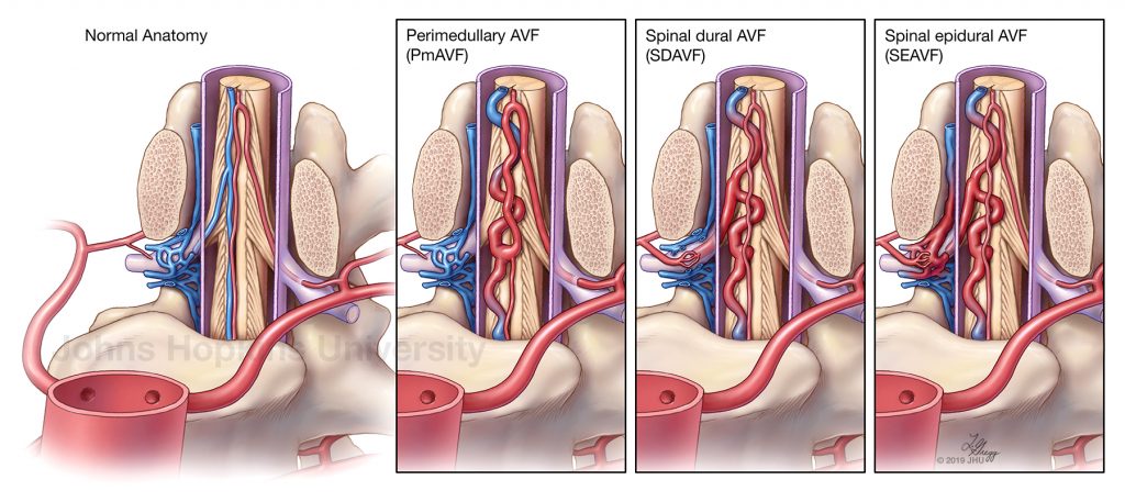 The Normal Anatomy and three main types of low-flow spinal arteriovenous fistulas (AVF): Perimedullary, Spinal dural, and Spinal epidural AVFs. © 2019 JHU, artist: Lydia Gregg.