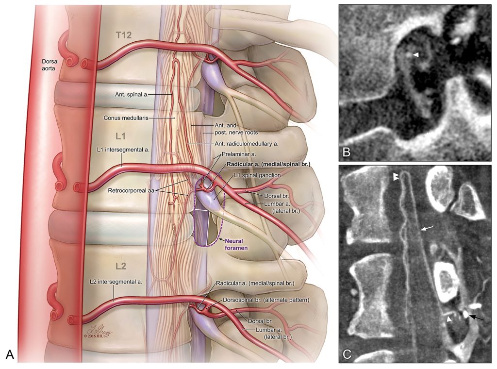 “Arterial anatomy of the neural foramen” Handbook of Clinical Neurology. Chapter 15, Gailloud P. © 2016 JHU, artist: Lydia Gregg.